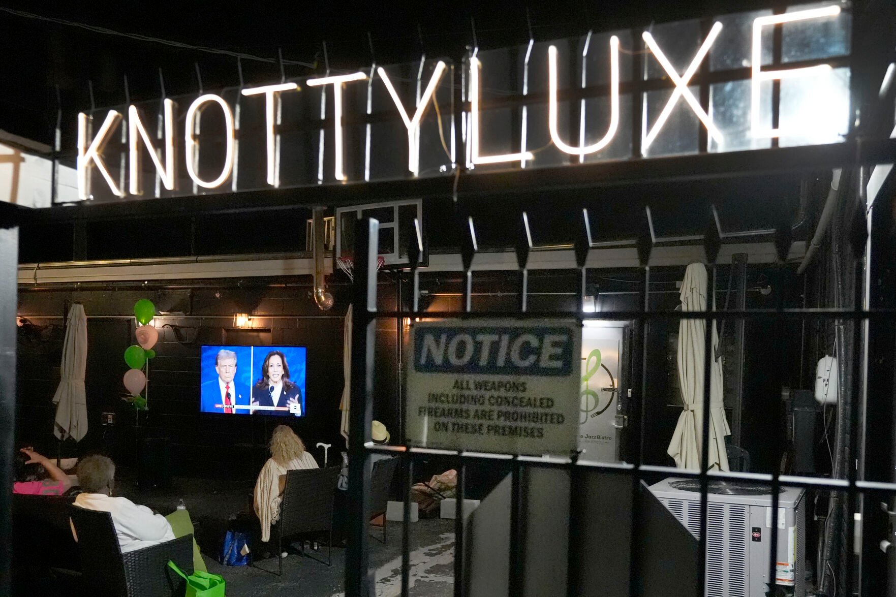 Christine Bell, left, 56, and Tara Correia, 56, watch the presidential debate Tuesday between Republican presidential nominee former President Donald Trump and Democratic presidential nominee Vice President Kamala Harris at the Taste Food & Wine in the Rogers Park neighborhood of Chicago.