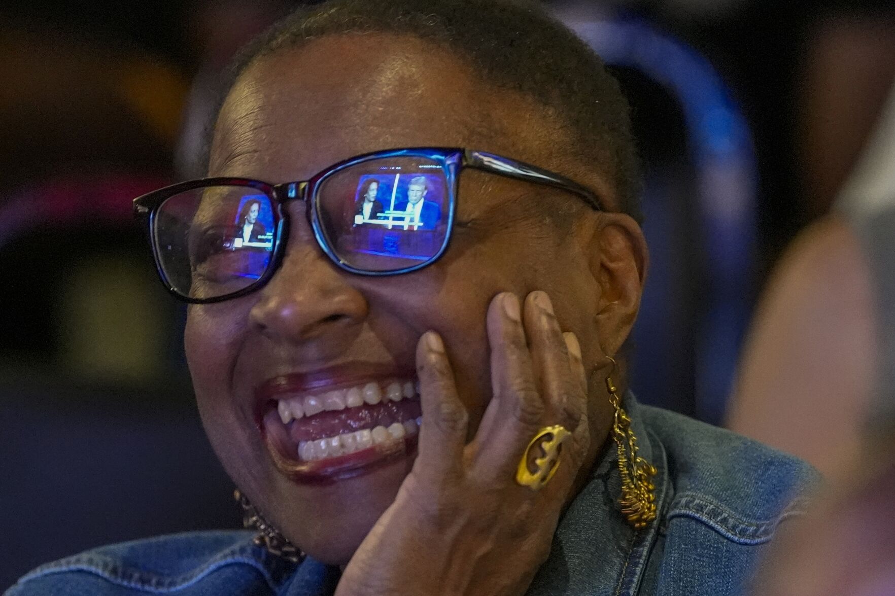 Charles Hudson, 76, of Chicago watches the presidential debate Tuesday between Republican presidential nominee former President Donald Trump and Democratic presidential nominee Vice President Kamala Harris, at the Knotty Luxe Bistro in Markham, Ill.